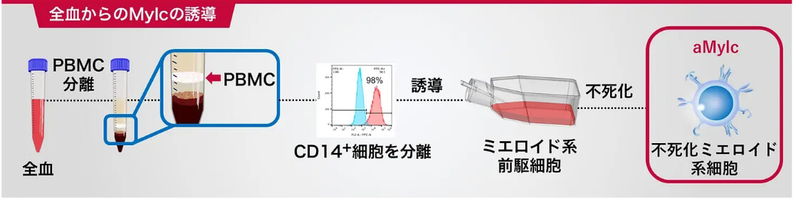 aMylc細胞(Myeloid lineage cell)は血液の中の単球を取り出し作製した不死化ミエロイド系細胞です。